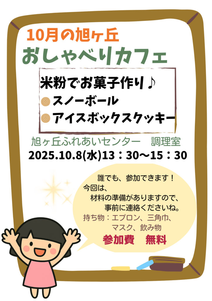 『おしゃべりカフェ』あさひ夢のまち協議会との共同企画 第4回目の、10月は「米粉のお菓子を作ろう!」です! お問い合わせ、お申し込みは公式LINEへ