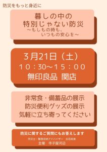 無印良品関店にて、防災イベントを行います 今回は非常食についてです アルファ米の試食や食料備蓄品の展示を行います せき防災の会の防災士が、質問にもお答えします ...